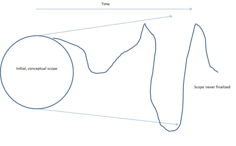 One of the less familiar aspects of scope management that plague the software industry is the team’s inability to articulate the requirements. These requirements manifest themselves as the rough draft of “wish lists.” This may also include some of those “gold-plated” features that are thought to be adding value. However, since these requirements are not solidly grounded in the technical, operational, and economic feasibility, these requirements do not strategically relate to winning more business, streamlining multiple channels of engagement, increasing employee performance, etc. These kinds of requirements become the "scope drifters" and are often a "productivity spoiler" and "promises stealer" because the business team fails to articulate the requirements clearly for subsequent analysis and design.