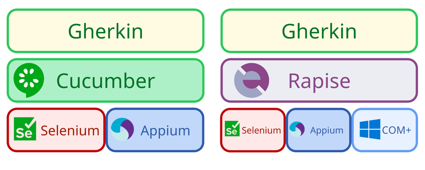 - Cucumber only interprets Gherkin, Rapise can also interpret Javascript and RVL