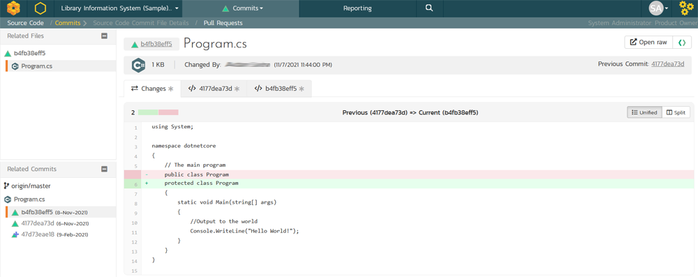 Spira includes the ability to quickly and easily drill down onto a specific commit and see the files that have changed, with inline code difference viewing. The Associations tab lets you have traceability from every code change made in the application to the relevant requirement, incident, or task that necessitated the change.