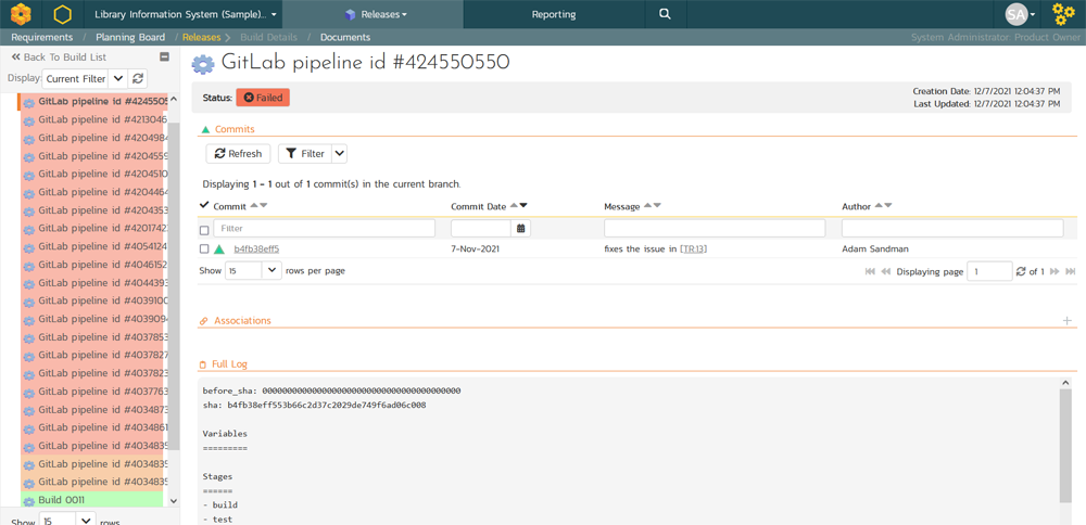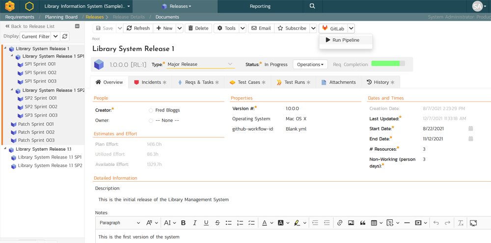 The new integration with GitLab CI pipelines will allow you to execute a GitLab CI pipeline directly from the Spira user interface. In addition, the GitLab pipelines may be automatically triggered by source code commits or other events from within GitLab itself.