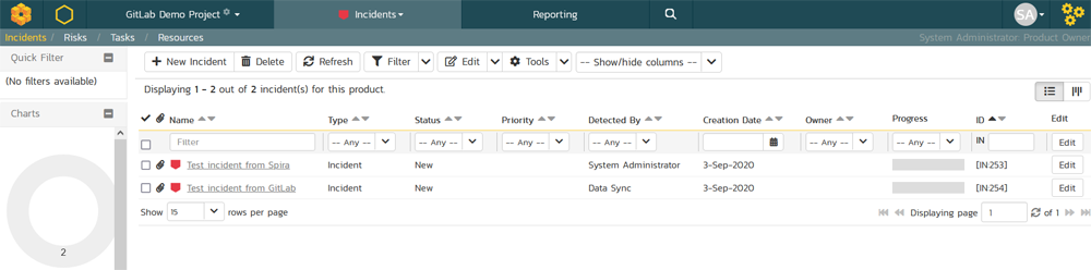The third aspect of the GitLab integration is the ability to synchronize the Spira incident tracker with the issue tracking module of GitLab projects:
