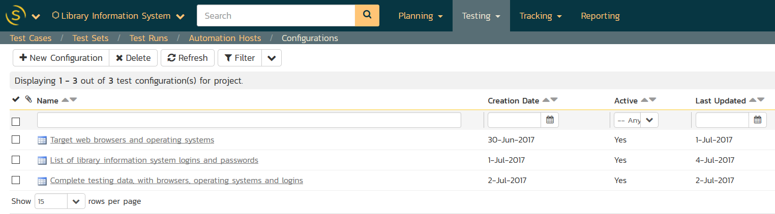 The new Test Configurations module in SpiraTest (which resides under the main Testing menu) lets you create different 'test configuration sets' which can be used to store different combinations of test data that will be used during testing: