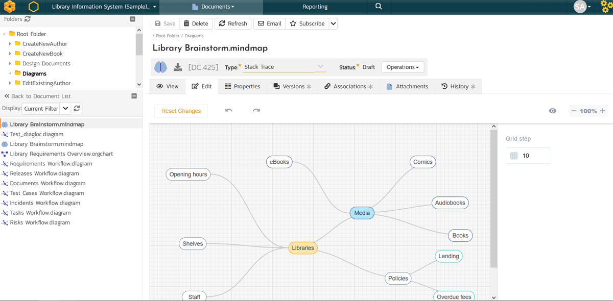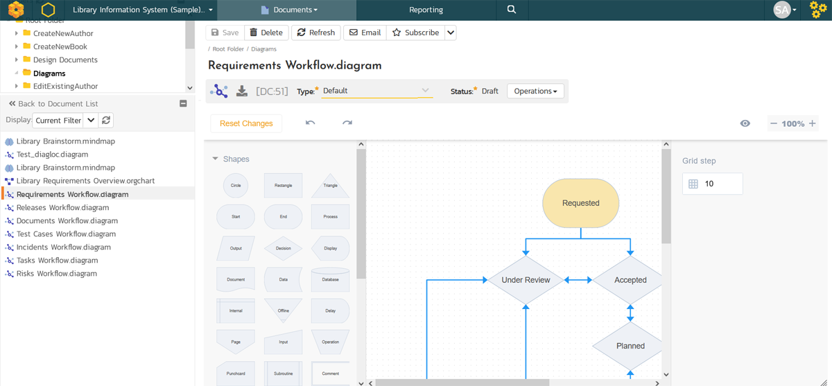 The new diagram editor is integrated into the Spira document management system. In addition to the ability to create textual content in Markdown, Rich Text, and BDD Gherkin formats, you can now choose to create three different types of diagrams in Spira: