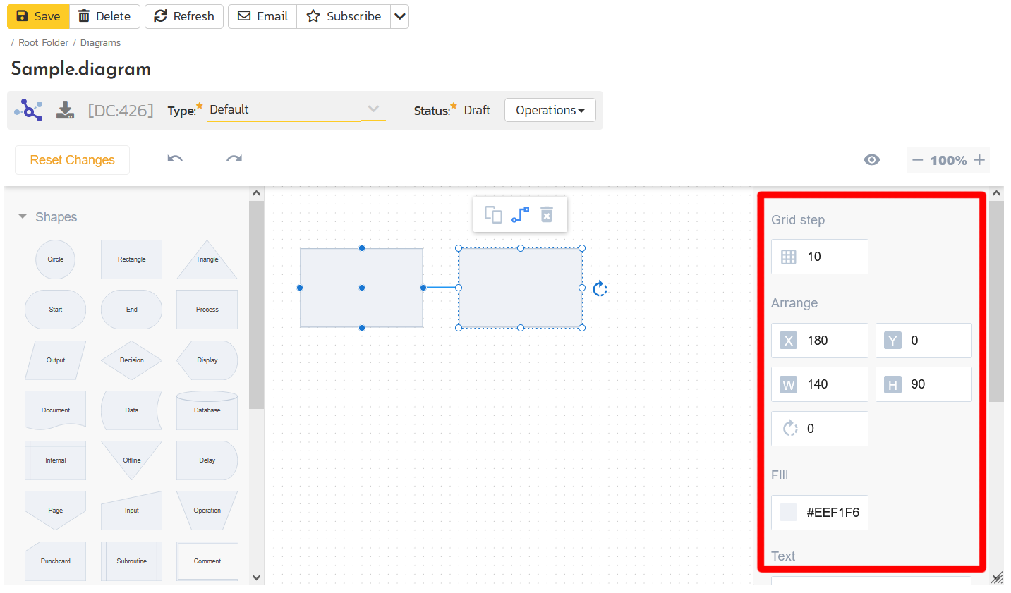The right-hand side contains the properties pane. This displays the properties associated with the currently selected item. This could be the color, size, and orientation of the shape, as well as the text. When you have nothing selected, it lets you adjust the properties of the main drawing grid itself.