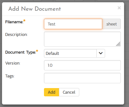 Just like creating a new document, when you create a new spreadsheet, you will need to chose the filename, description, type, folder and (optionally) any meta tags: