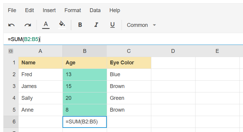 Suppose we want to add a calculated row that displays the sum of all the ages of the users. That's easy, you just click on the cell where you want the result and start entering the formula (in this case =SUM) just like you would in Excel or Google Sheets.