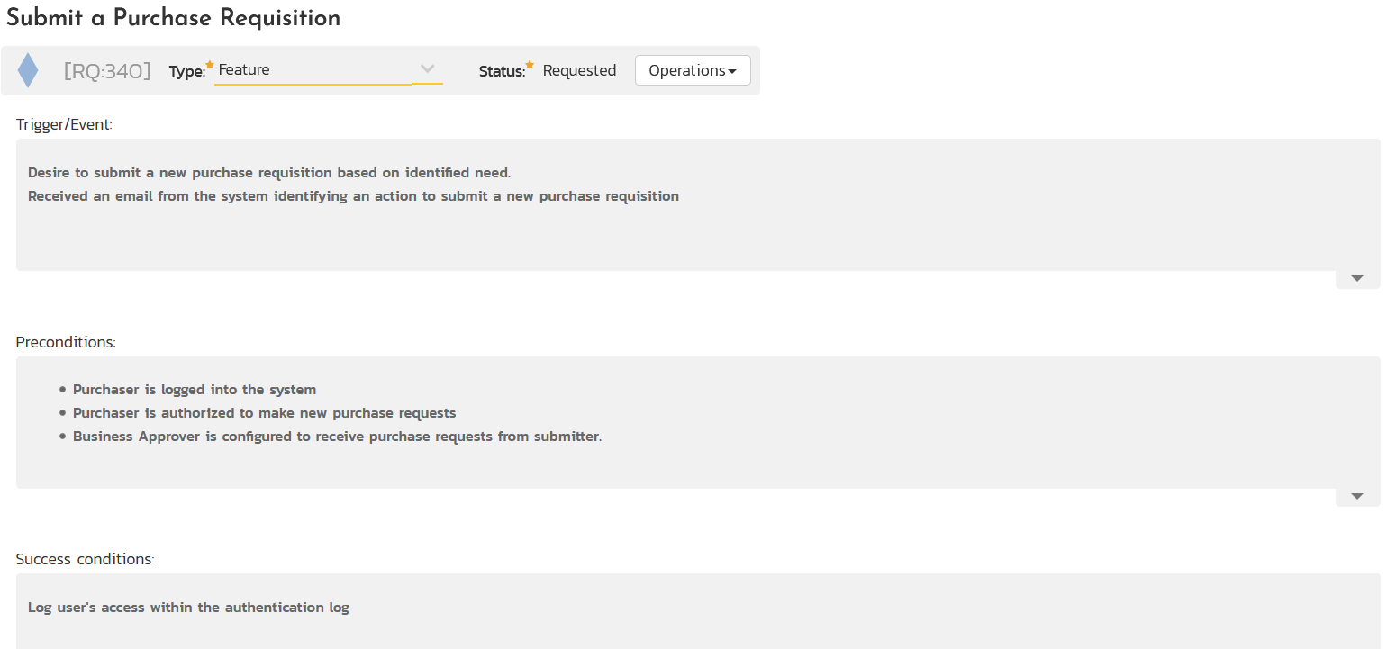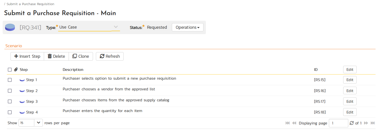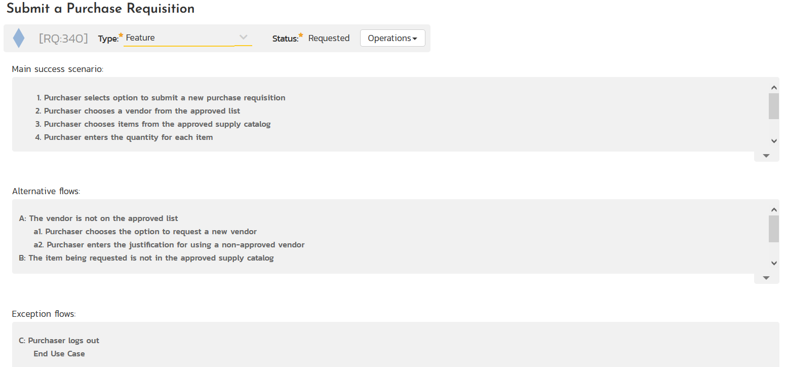 We are gathering requirements following a standard template for use cases. In that template we record main scenario and alternative flows like shown on the example below. What is the best way to map primary and alternate use case process flows to requirements inside Spira?