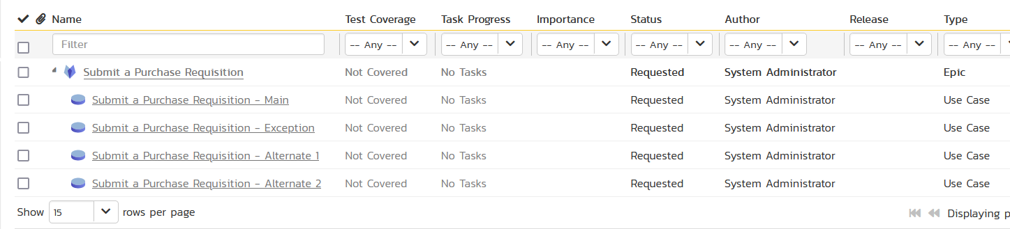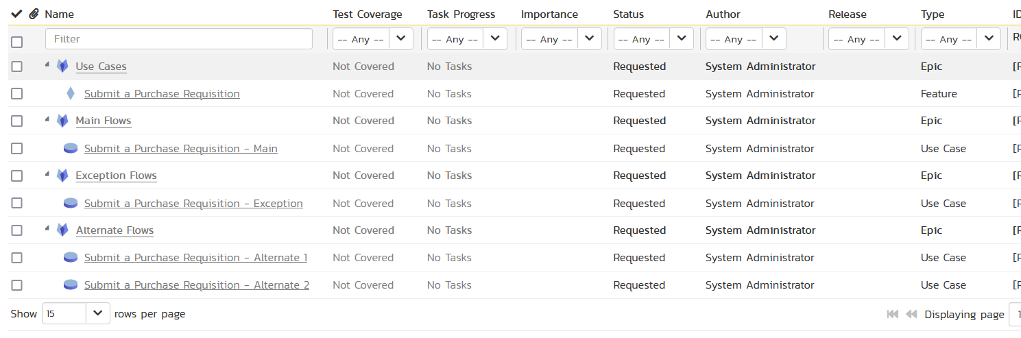 The advantage of this method is that you can have an easy to visualize hierarchy of requirements, with the use cases nested under each requirement, and the ability to easily display the use case diagrams. The main disadvantages are that it makes all the requirements Epics and limits how the statuses and workflows can be used because the child requirements drive the workflow of the parent. This method is more work to setup than Option 2, but easier than the next and final option...