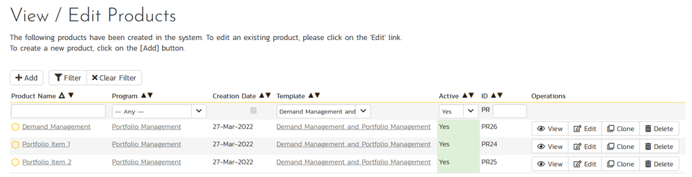 In this example, we have created a dedicated product template called "Demand Management and Portfolio Management" that will be used to manage the customizations and workflows associated with the demand management process. Viewing the product in the main navigation would look something like this: