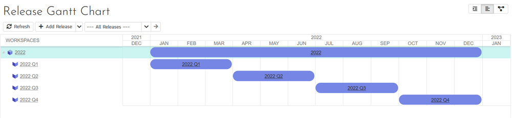 In addition, we can use the release Gantt chart view to create a major release for each year and phases for each of the quarters in the year. This will allow us to easily track the planned new applications and activities by quarter: