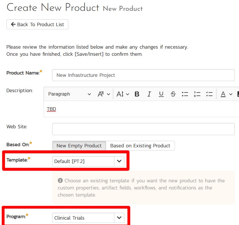 You will be able too choose either an existing product template or create a new bespoke one, depending on whether this new product will use an existing development methodology or a new one. In addition, you will be able to group this approved new product under the appropriate SpiraPlan program and portfolio so that it can be managed.