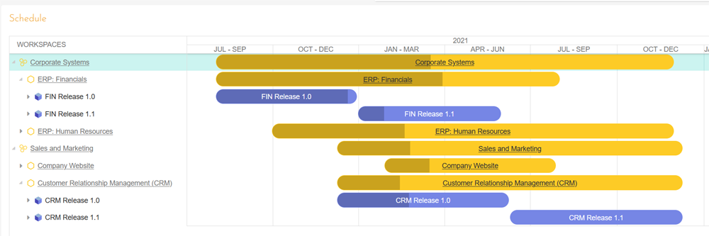 The new product will appear in the timeline, nested under its appropriate program and portfolio. As the product is defined and refined to have its own release schedule and cadence, those releases will now appear in the timeline along with the % complete shading, let you know the progress of the product. At this point, we are no longer in the demand management phase of this new idea, but instead into program and portfolio management.