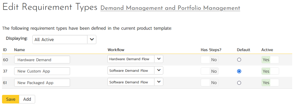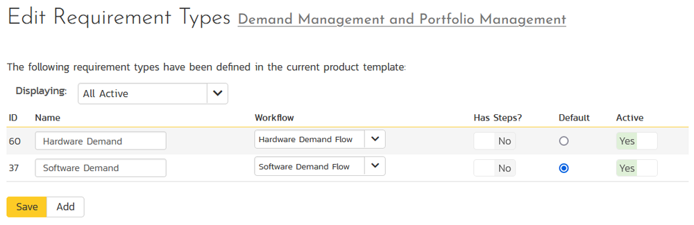 The first thing to do is create the different requirement types for the different types of new application that will be requested. In this example, we have simply added a single type called "Demand" and mapped it to the corresponding workflow for new software projects.
