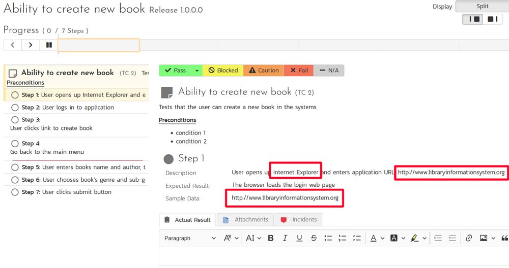 Then, when you execute the test case, SpiraTest will dynamically replace all instances of the variable names with the appropriate value. For example, in the test case below, the name of the web browser and the initial URL have been replaced dynamically with actual values: