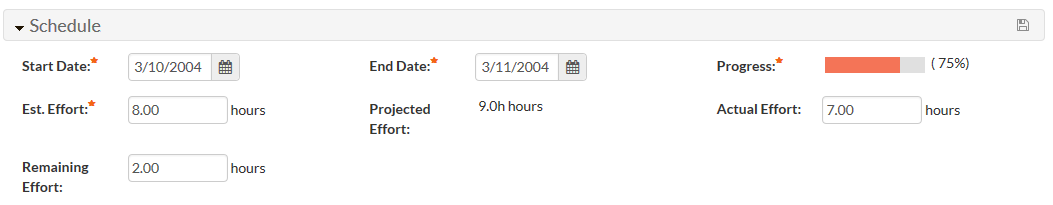 - Remaining Effort - Next, each Task (and Incident) has a 'Remaining Effort' field, this is initially set to be the same as the Estimated Effort (e.g. 8 hours) then as the developers work on the task, the Remaining Effort is decreased (i.e. I have 2 hours left so it is 2 hours remaining, which would be 75% complete for the 8 hour task in question)