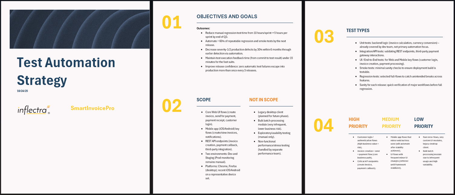 Using our template shown above, we’ve filled out each section with sample information, so you can see what a real (hypothetical) test automation strategy document could look like: