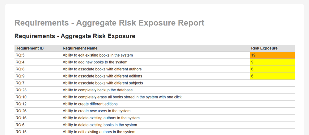 <table class="DataGrid"><tr><th>Requirement ID</th><th>Requirement Name</th><th>Risk Exposure</th></tr>