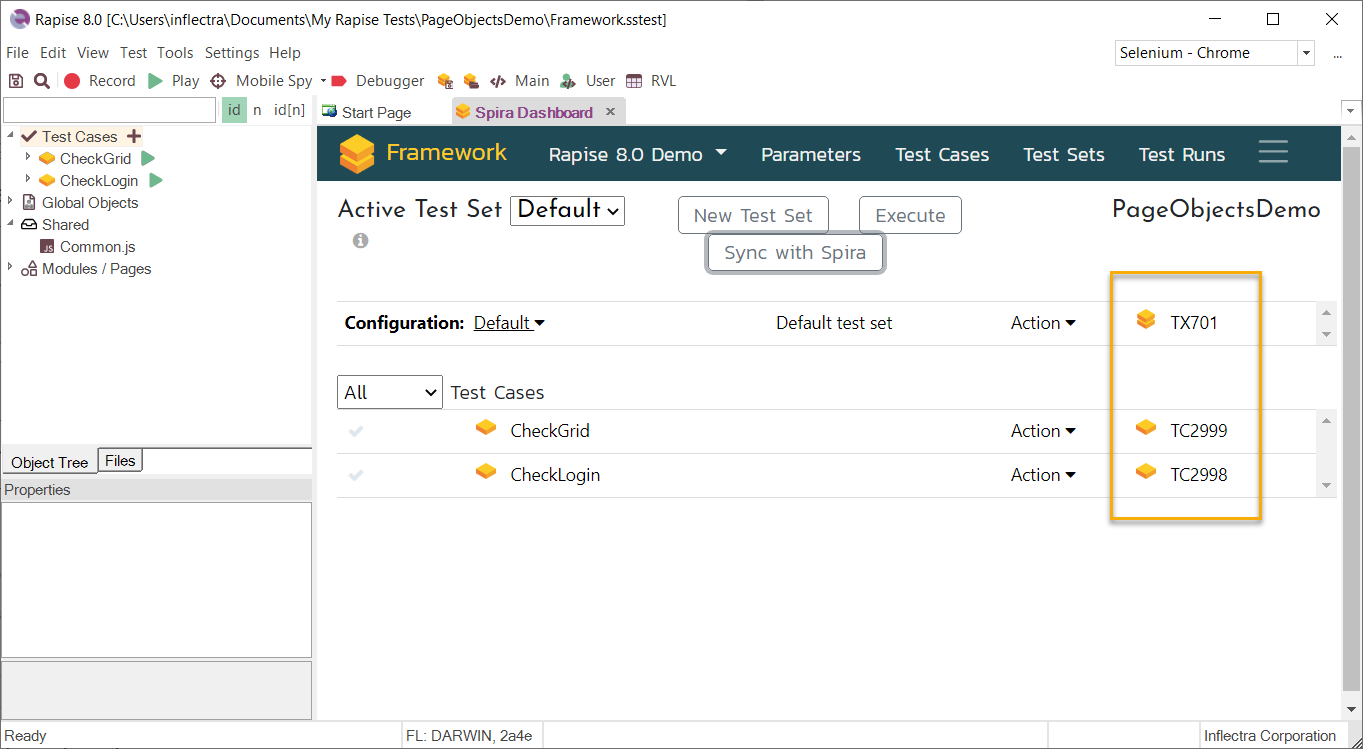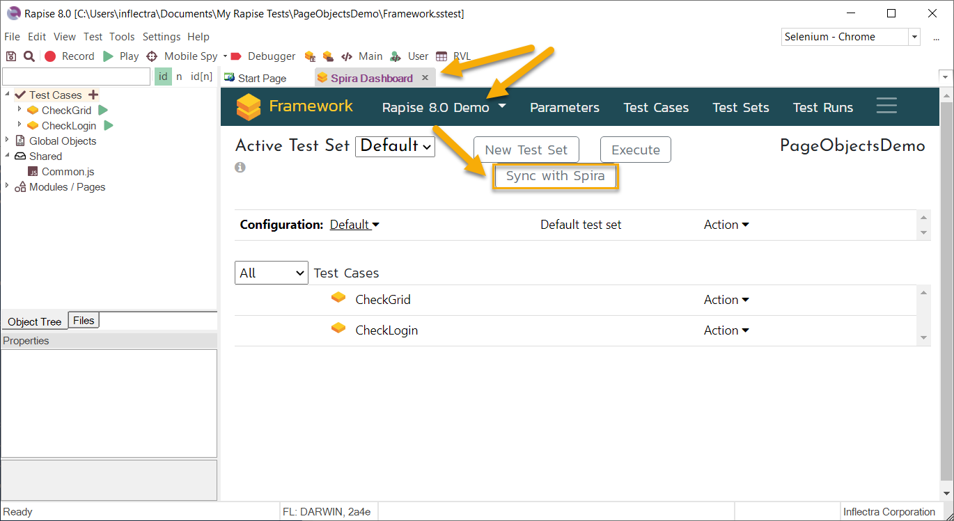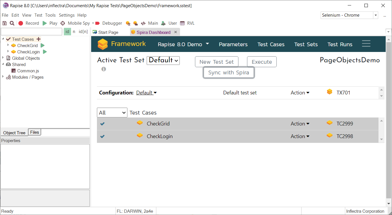 Open the test framework in Rapise, select a project in Spira Dashboard and click Sync with Spira button.
