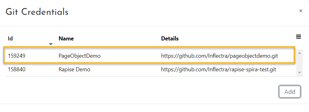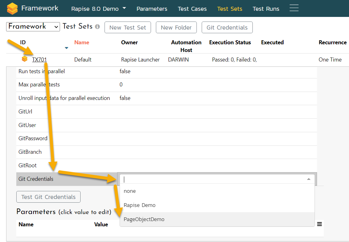 Now expand the test set by clicking on it's ID, scroll down to the Git Credentials property, double click it's empty value and select PageObjectDemo credentials.