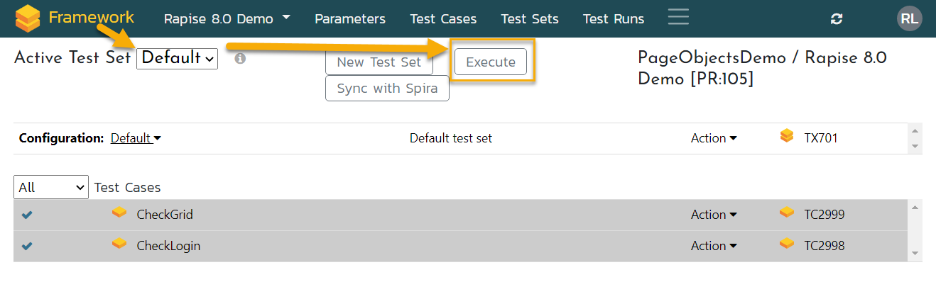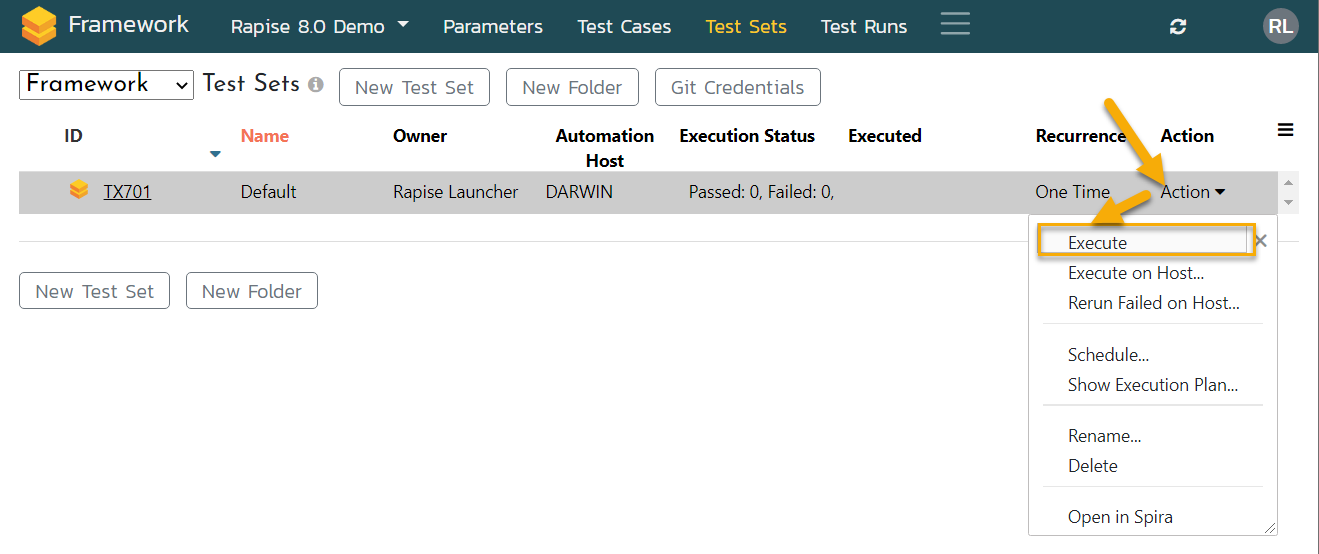 You are now ready to run the test set via RapiseLauncher. Run it from the Test Sets page using Actions menu: