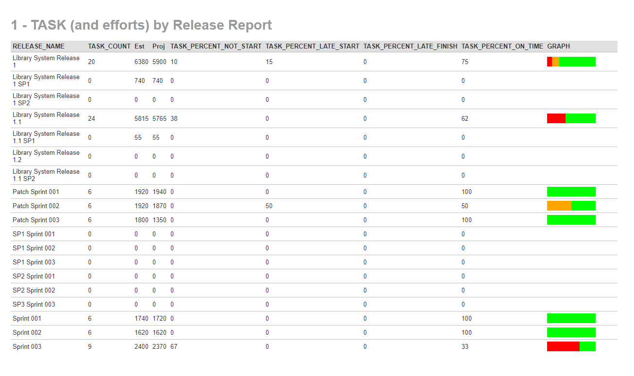 The output of this will be the content of the R_Releases custom report view for current product and this is the same output as displayed by Release Task progress widget from the Product home page.
