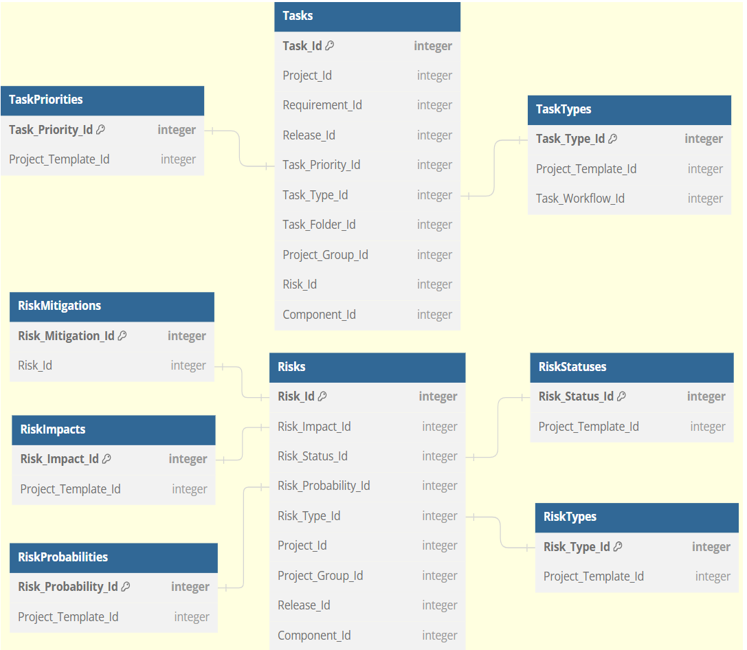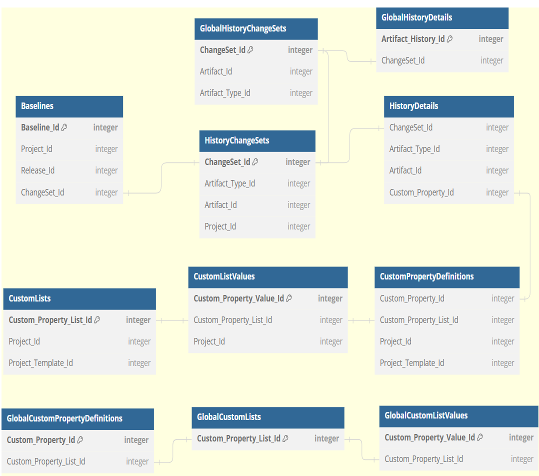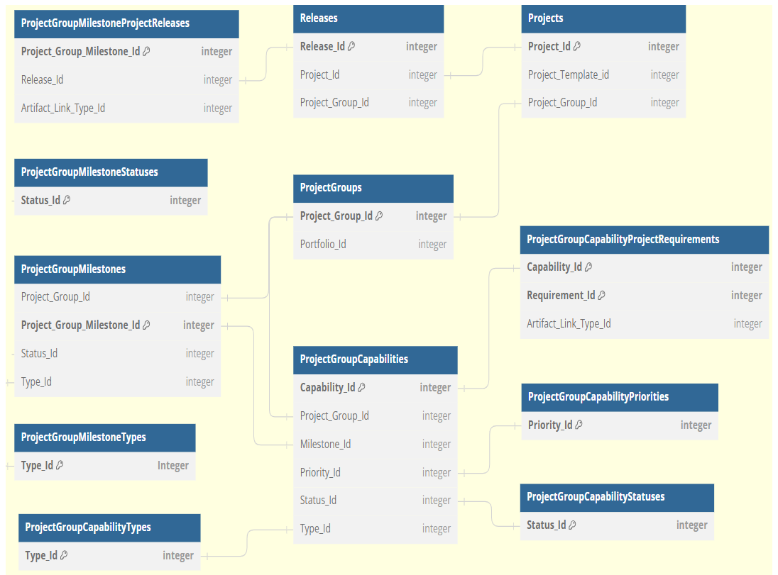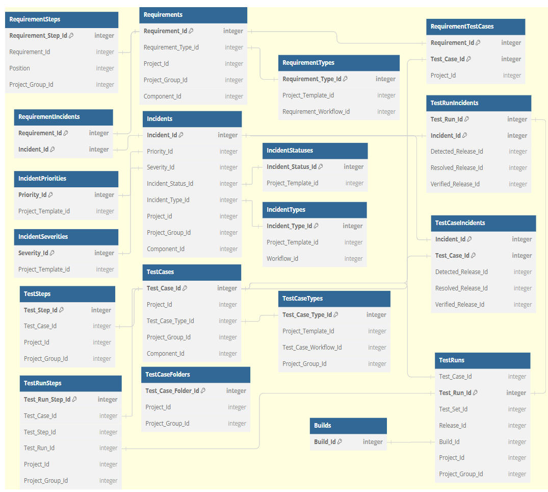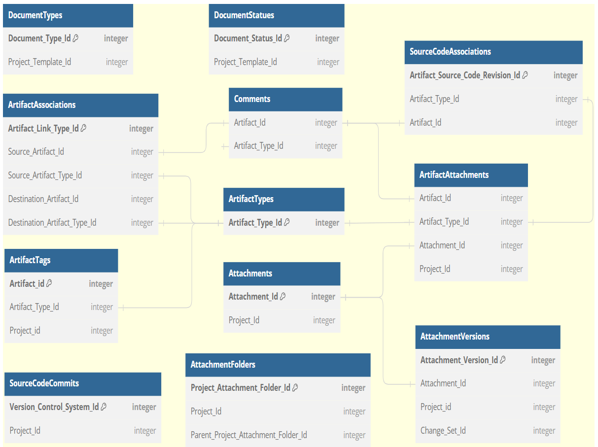 Spira has three editions (SpiraTest, SpiraTeam, and SpiraPlan). Since each edition builds on the previous edition with more features, there are various tables that are exposed as the available tables in SpiraDocs. The relationship exposed here can be derived from the primary_keys (unique to the table) and the foreign_keys (relationship to another table). If all the tables are represented in a single model, it will be complex and unreadable. So, some higher level model simplification is required.