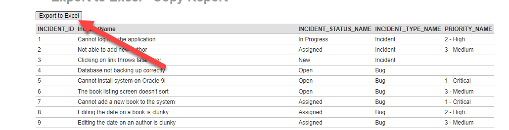 8. If you will click on Generate Default Template button, you will get a normal report as a table of data. It will be a five-column table with incident info: IncidentID, Incident Name, its status, type and priority and that will also work for reporting purposes after saving changes.