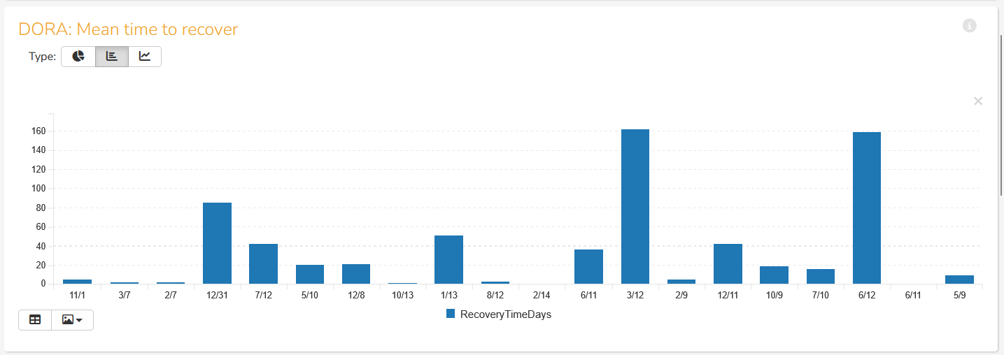 The one issue with the previous graph is that it shows the MTTR by release, but not by date. We can easily fix that by using the release end date for the x-axis instead: