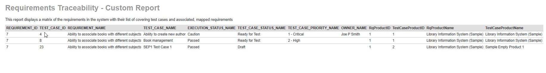 <table class="DataGrid"><tr><th>REQUIREMENT_ID</th><th>TEST_CASE_ID</th><th>REQUIREMENT_NAME</th><th>TEST_CASE_NAME</th><th>EXECUTION_STATUS_NAME</th><th>TEST_CASE_STATUS_NAME</th><th>TEST_CASE_PRIORITY_NAME</th><th>OWNER_NAME</th><th>RqProductID</th><th>TestCaseProductID</th><th>RqProductName</th><th>TestCaseProductName</th></tr>