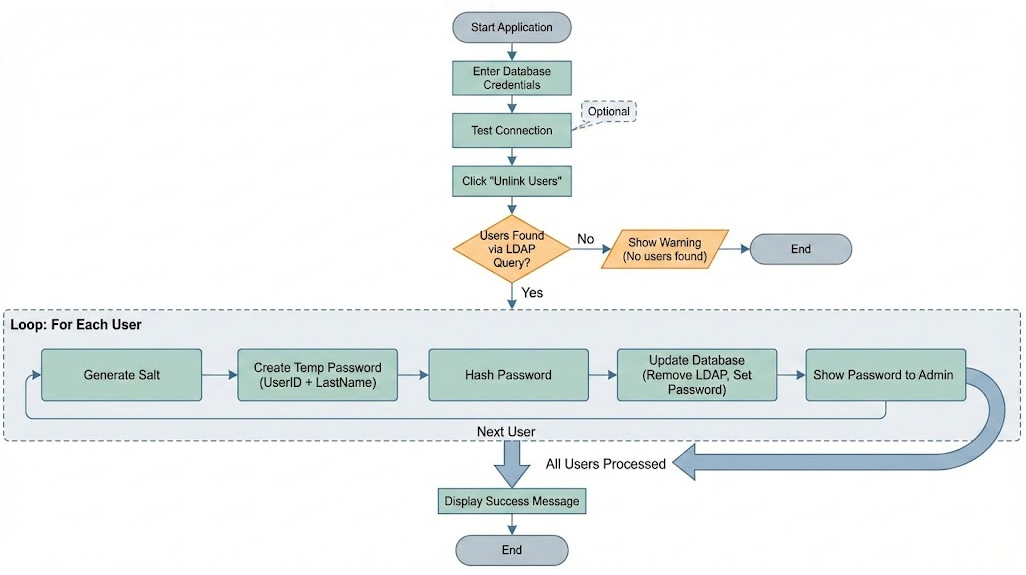 5. **No Filtering:** Unlinks ALL LDAP users (no selective processing)