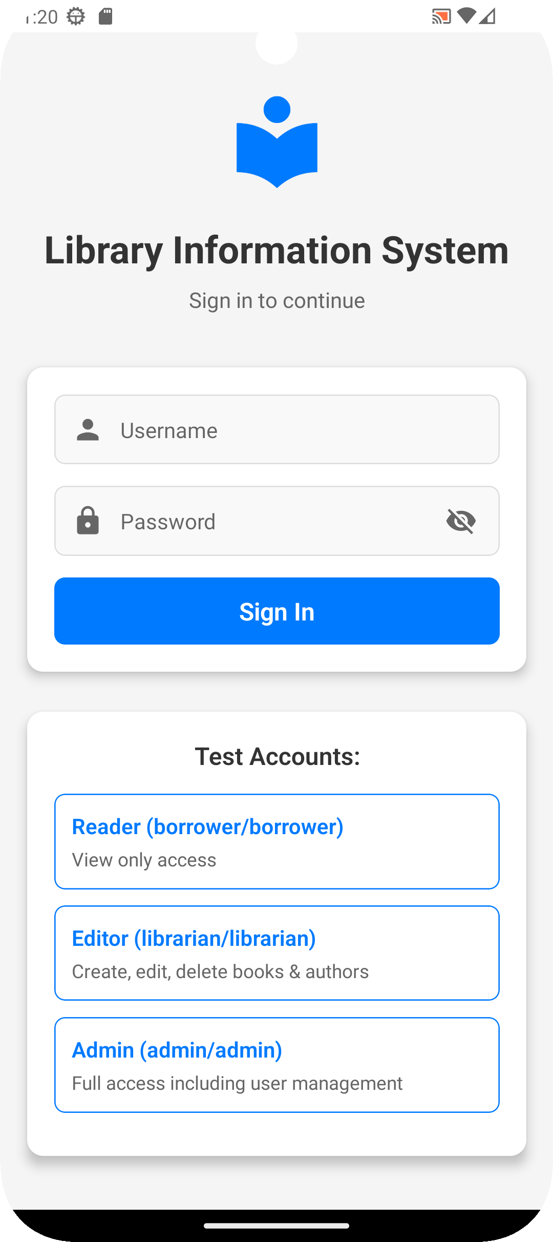 The Library Information System (LIS) is a sample Android application built to help test automation engineers practice creating mobile tests in Rapise. The app simulates a standard library management system with role-based access control, CRUD (Create, Read, Update, Delete) operations, and standard mobile UI controls such as text fields, dropdowns, date pickers, and toggle switches.