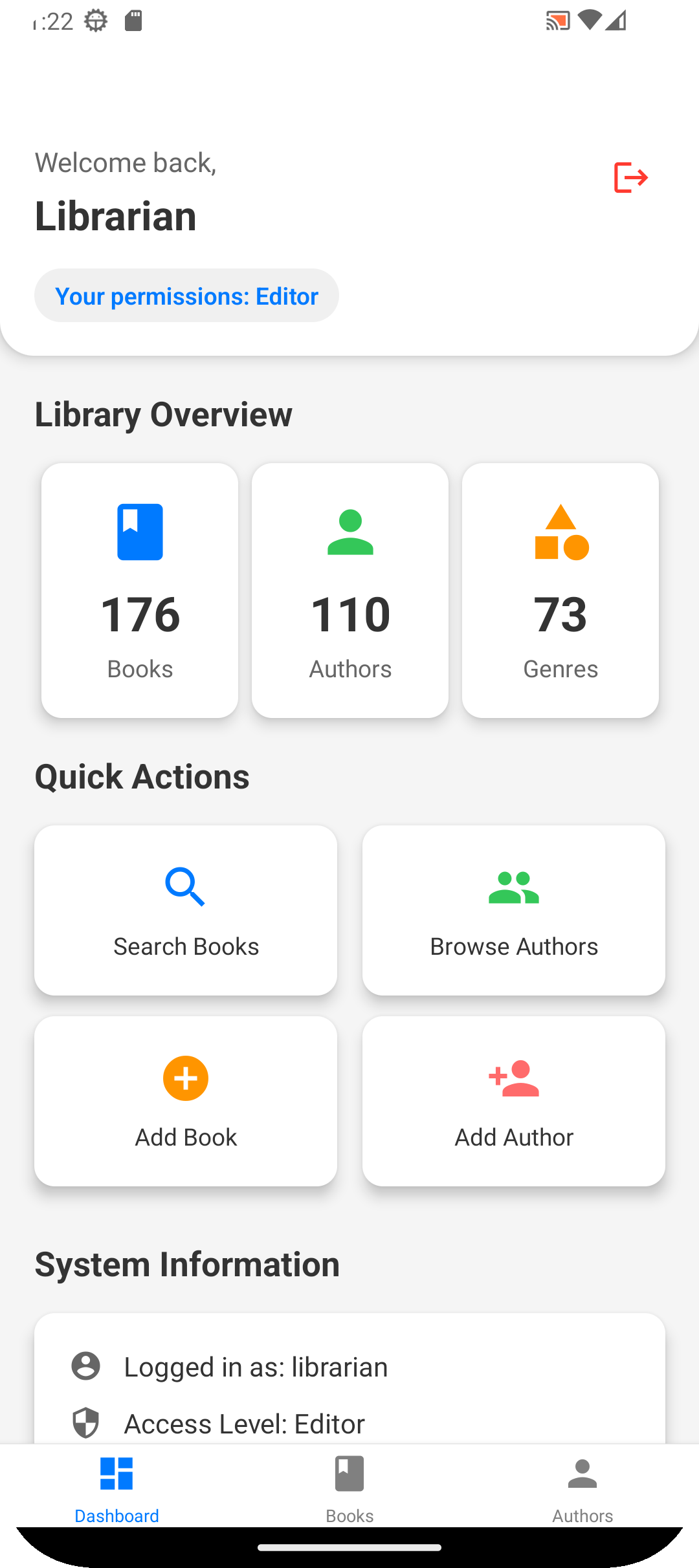 Editor: Username: librarian | Password: librarian (Create, edit, and delete books & authors)