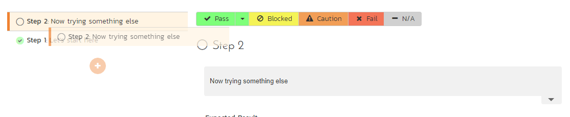 In this interface, you can add steps, drag and drop to reorder them, clone them, delete them and enter/update the Description, Expected Result, and Actual Result. This gives you an alternate way of running tests that is suited to exploratory and session based testing: